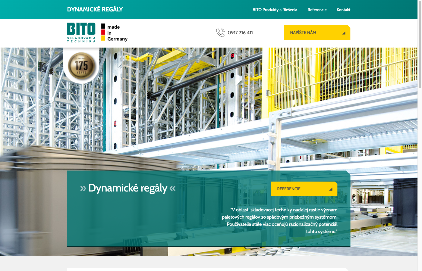 Dynamic Shelving is a product website built for BITO-Lagertechnik, a 175-year-old German storage technology manufacturer. The site showcases their dynamic flow-through racking systems for the Slovak market, providing detailed product information, technical specifications, and downloadable catalogs for warehouse professionals.